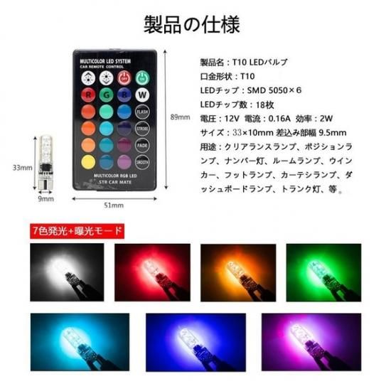 (ネ)LED ウェッジ球 T10 RGB HOTARU ホタル 2個セット レインボー16色切替 ストロボ点灯切替機能付 T10-HOTARU-RGB-2